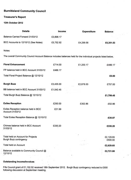 Council grant had been received and the Burgh Buzz contingency reduced giving a