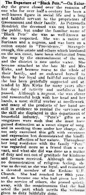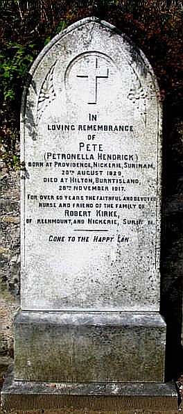 After the children had grown up Robert Kirke offered to pay Pete’s passage back to Surinam and to get her a husband. She refused the offer saying her place was looking after the Kirkes. That devotion was reciprocated as her headstone testifies.