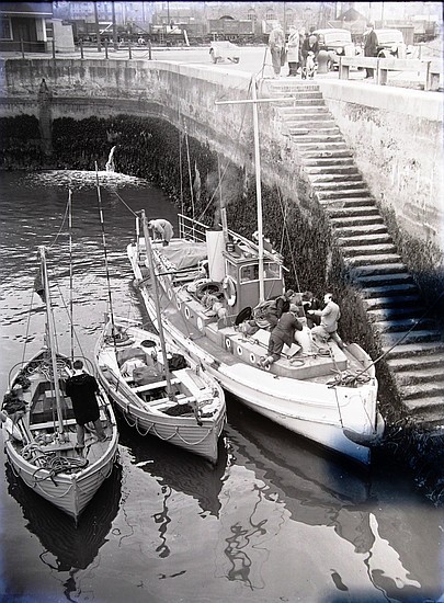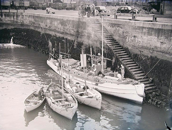Chris Claydon sent us these two photos (above and below) of the vessel 'Tommy' (with the funnel) at Burntisland, probably in the tidal harbour. They were taken on 5 June 1954. Chris tells us that the vessel was owned by James White from St. David's, and that she was hired by the National Coal Board to conduct seismic tests in the Forth, off Kirkcaldy, prior to drilling operations. Notable are the large number of railway wagons in use in those days, and the splendid old cars.