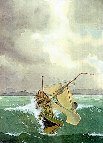 Two artists' impressions of the sinking of the baggage ferry. On the left - by Eric Bell.