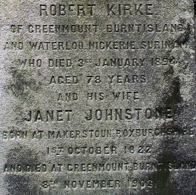 Robert Kirke's widow, Janet, died at Greenmount in 1903 following a stroke. From the Fifeshire Advertiser after her death: "Mrs Kirke was never ostentatious in her ways; she maintained the simplicity of her early years, and manifested the kindliness and gentleness which usually  come from the long experience of the variations of human life."